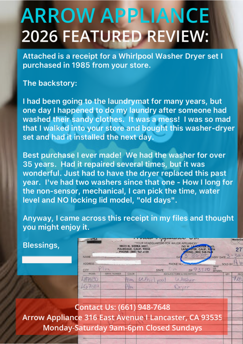 “As a Property Manager we have needed appliances from time to time for our units. I never hesitate to call them or refer them, they deliver what they promise. David is super at customer service and he has gone beyond his job duties to help us deliver a stove and refrigerator for a non-cooperating tenant. I want to include the delivery person and all the techs that work for Arrow Appliance. They are all very pleasant to work with. You will not find anyone else with a 6 month Warranty on used appliances that are as reliable as they are. They truly care! My only wish is they served the Greater Los Angeles, they rock!!!”